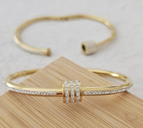 Le BRACELET BANGLE est un BIJOU élégant et intemporel, il est composé de STRASS montées sur une gourmette jonc avec une fermeture à charnière en couleur OR. Son design délicat et sa BRILLANCE en font un accessoire parfait pour les occasions spéciales, mais il peut également être porté au quotidien pour ajouter une touche de GLAMOUR à n’importe quelle tenue.